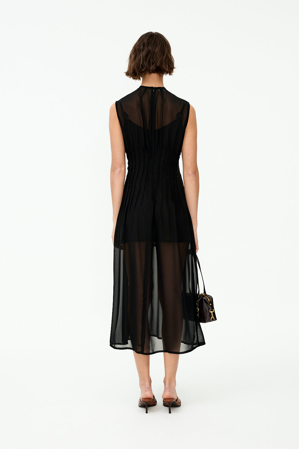 This black sleeveless midi dress is designed for city women who want understated elegance with a touch of drama. The georgette fabric flows beautifully over the body, creating a fluid and sophisticated silhouette, while the pintuck details on the front and back add subtle craftsmanship. Its short lining allows the fabric to remain light and slightly translucent, giving a modern, refined look. Perfect for evening events, dinners, or nights out, it pairs effortlessly with heels and statement accessories to elevate your style.
