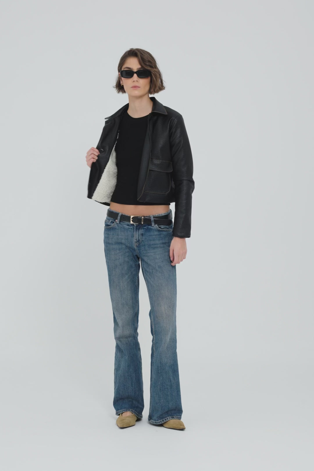 This short black jacket is designed for women who want their city style to feel effortless yet thoughtfully curated. The contrast between the sleek faux leather exterior and the cozy white shearling-style lining adds depth and dimension, while the warm ochre topstitching brings an unexpected, subtle detail. Layer it over tailored trousers for daytime sophistication or throw it over a dress for evening city outings. Its cropped cut and front pockets make it versatile, stylish, and easy to wear without overpowering any look.