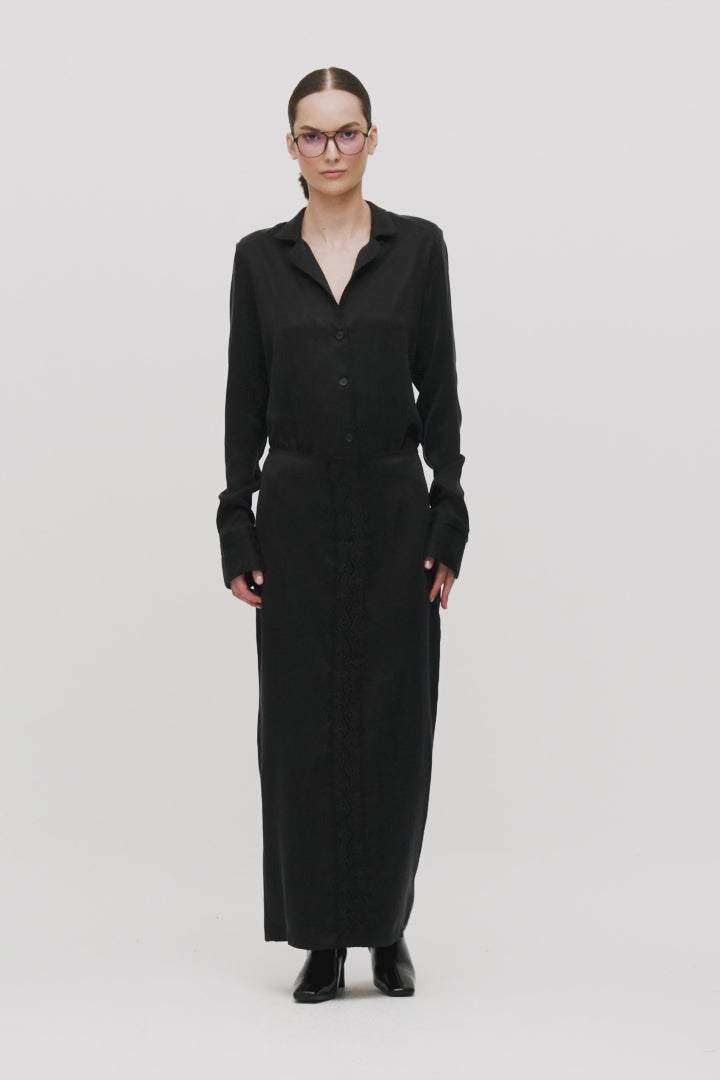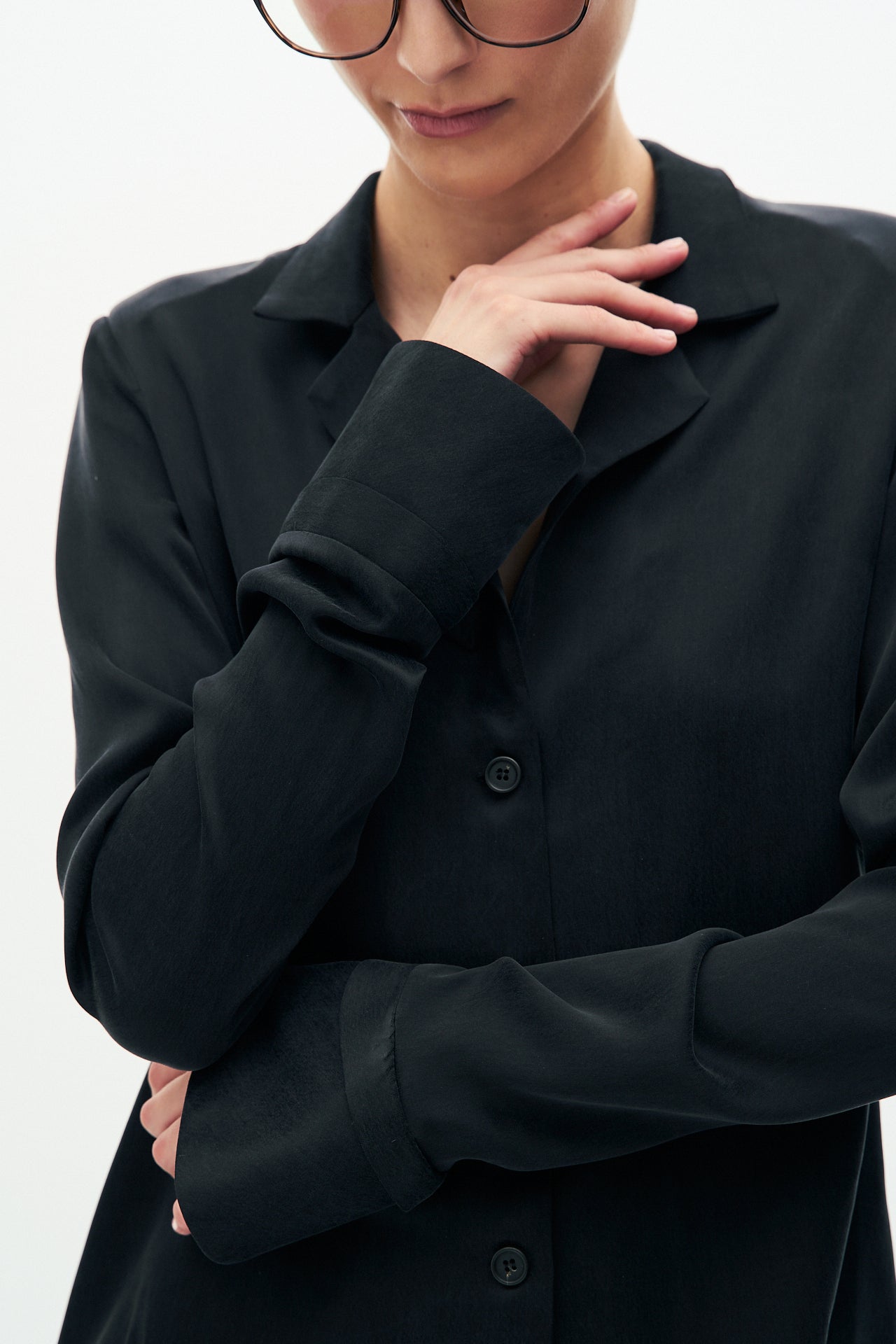 Made from cupro silk fabric, it fits straight, has shoulder pads and peak lapels.