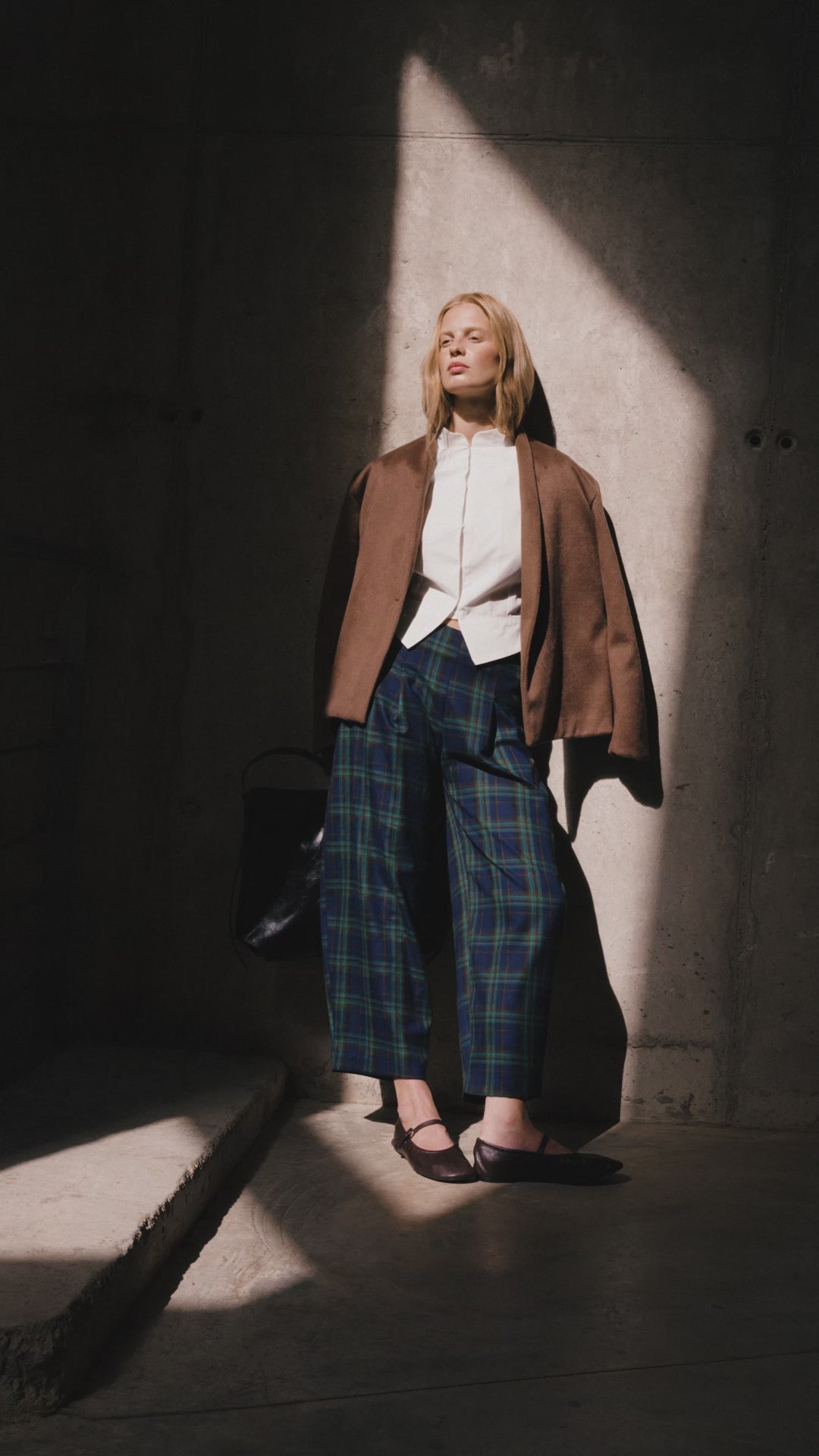 Mid waist trousers: this cut features a wide and loose fit from waist to ankle.. Front zip and top button fastening. Two side pockets. Two welt pockets on the back. Folded bottom.