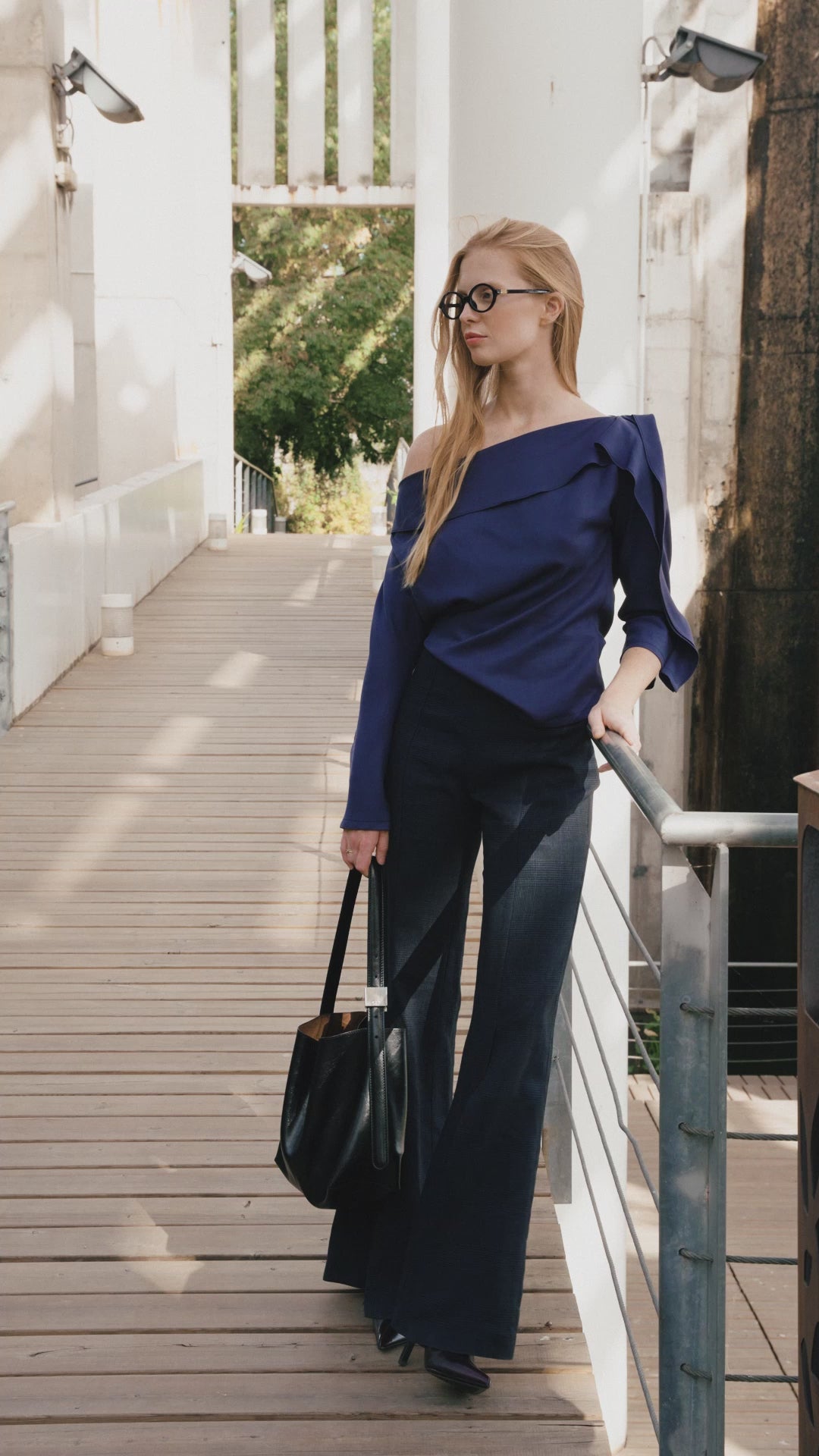 High waist trousers: straight silhouette from waist to knee and loose fit to ankle. Invisible zipper on the side. Crepe fabric in navy blue.