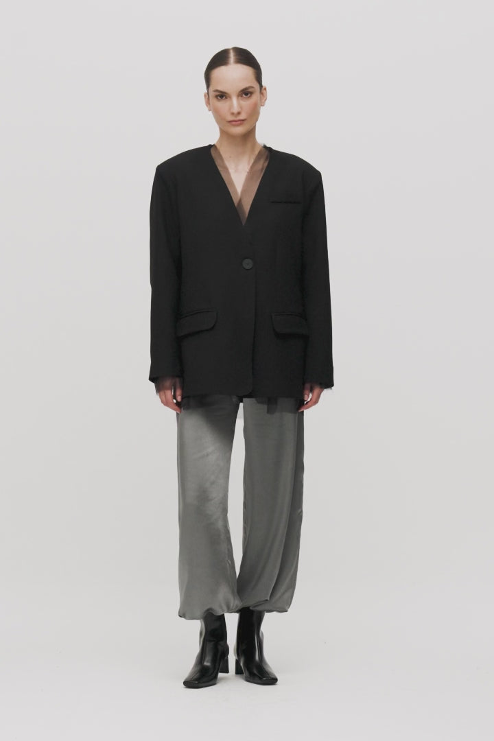 Blazer made with bi-stretch fabric. Oversize fit. Lapel collar. One-button fastening. Two flap pockets. Organza fabric detail underneath.