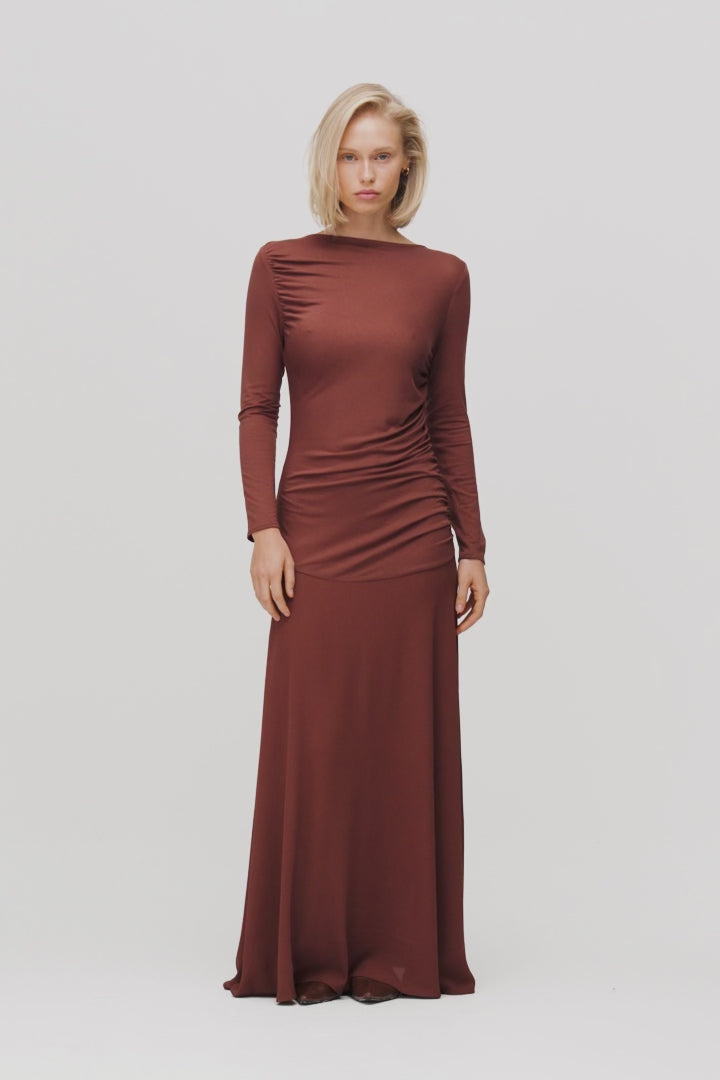 Dress made in knit fabric on the body and sheer fabric on the bottom. Long sleeves. Ruching on the front.
