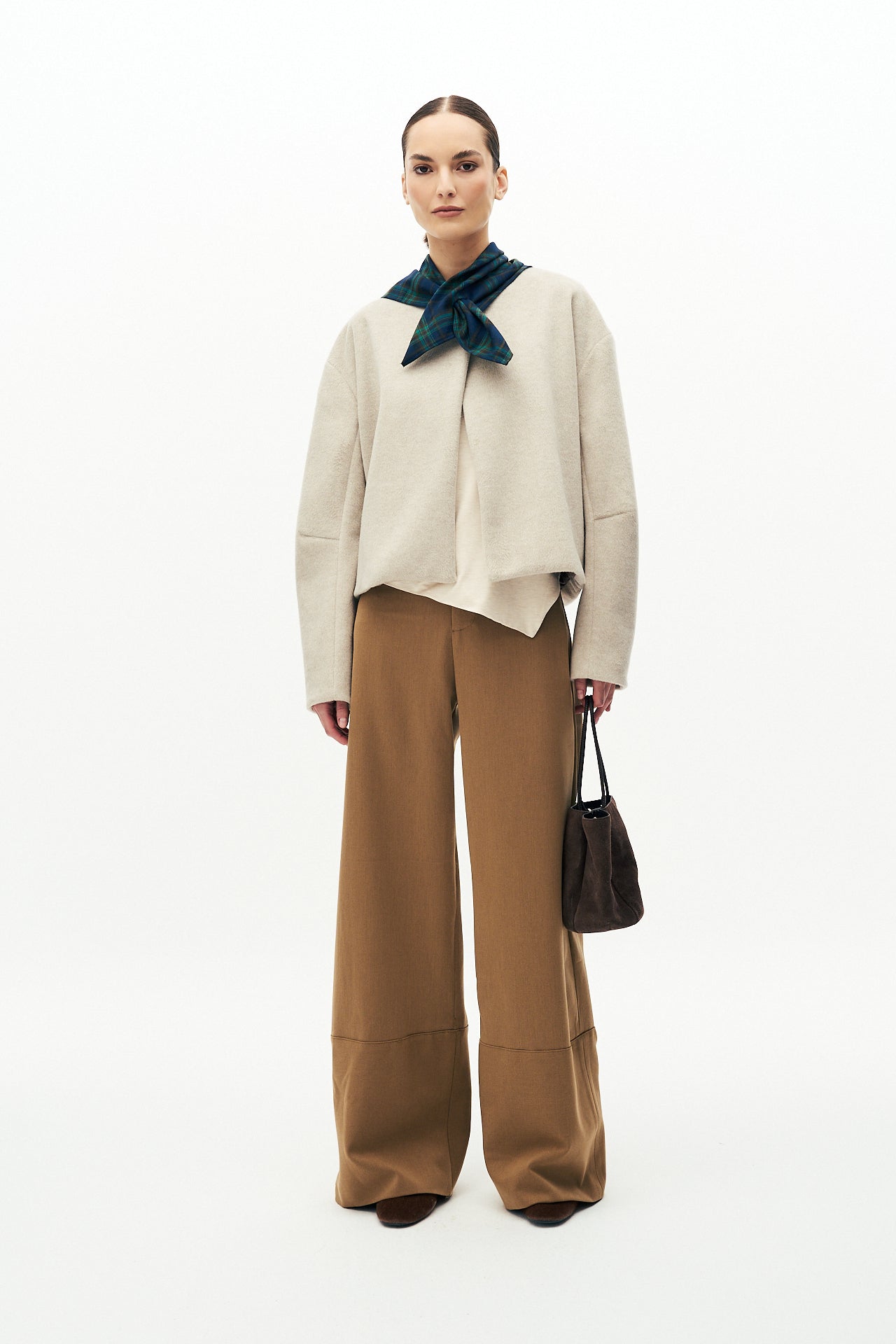 Mid waist trousers: this cut features a wide and loose fit from waist to ankle.. Front zip and top button fastening. Two side pockets. Two welt pockets on the back. Folded bottom.