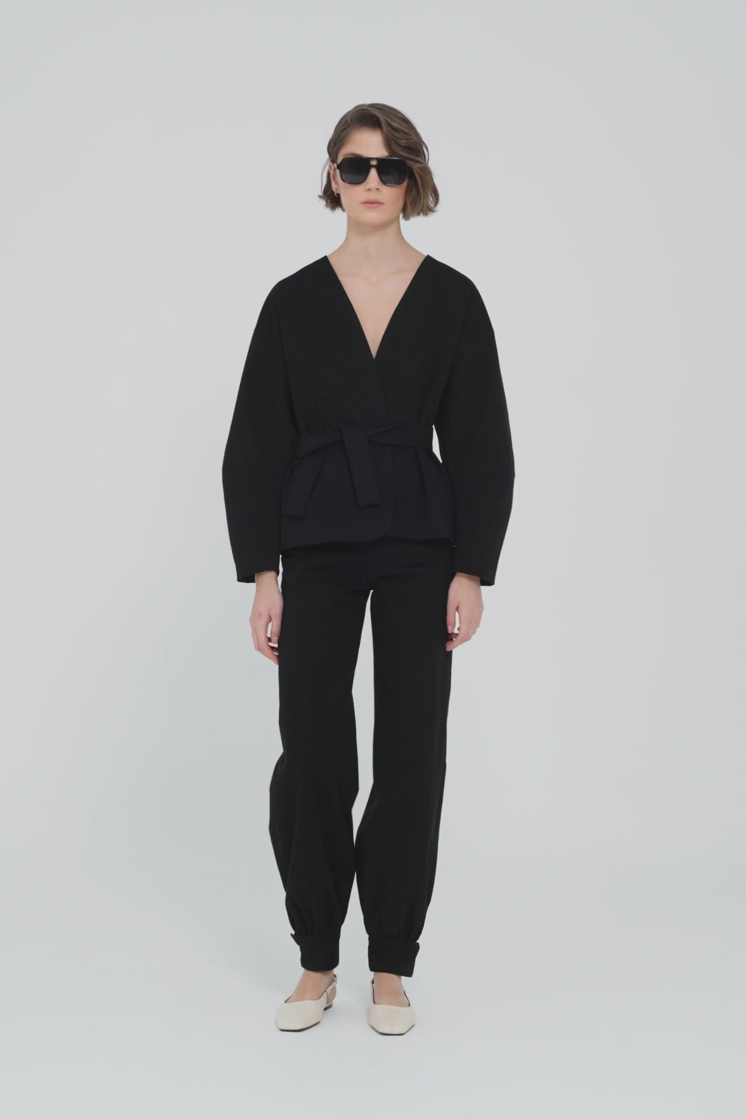 Esta chaqueta kimono de sarga de algodón negra es una prenda atemporal y moderna para el armario urbano. El tejido estructurado equilibra el volumen de las mangas, creando una silueta definida pero desenfadada. Llévala con los pantalones bombachos a juego o contrástala con prendas más ligeras para un estilo urbano de diario.
