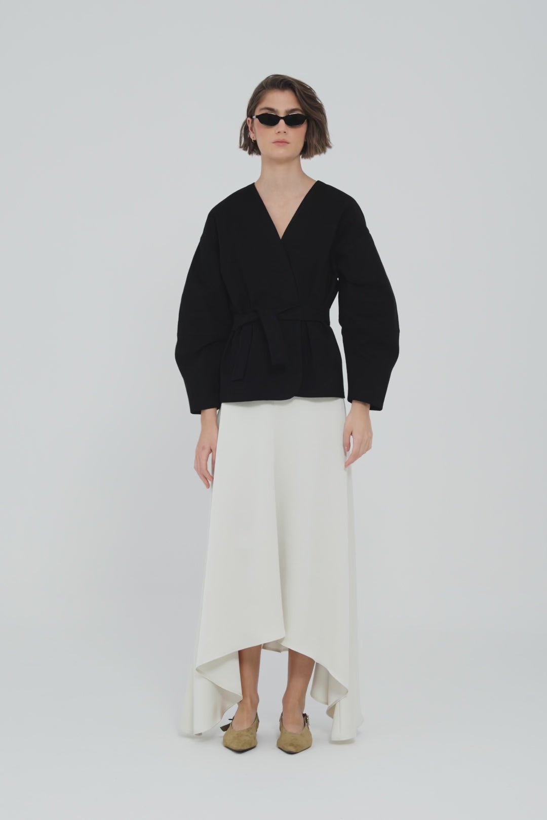 Volumen moderno: mangas abullonadas y estructura relajada.