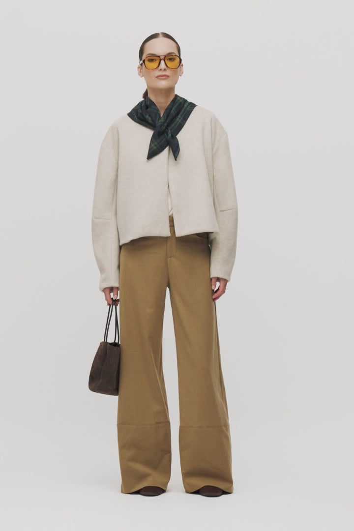 Jacket made of woollen blend fabric in ecru color. Long sleeves. One button fastening at the front.
